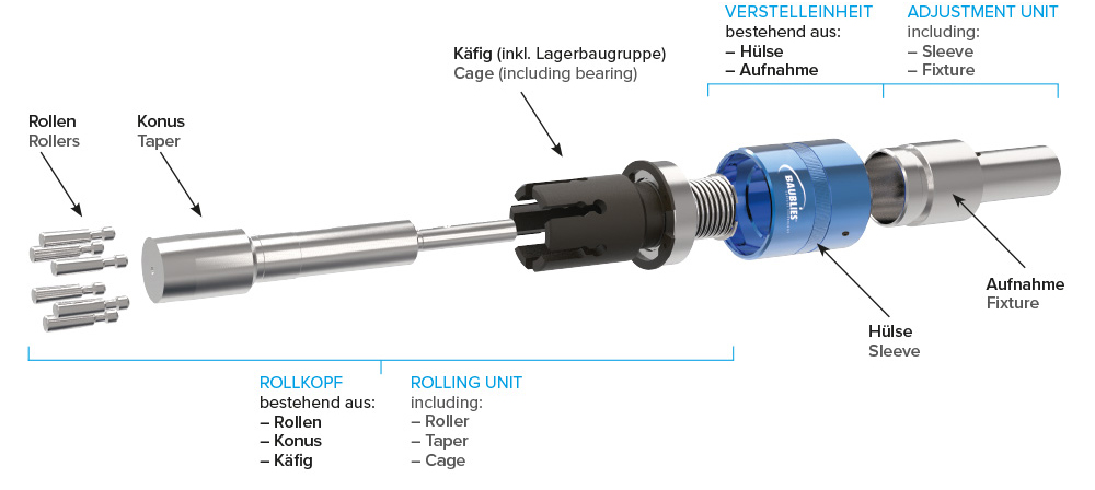 Ein Konus stützt die in einem Käfig geführten Rollen ab und sorgt für die Anpresskraft zum Umformen des Materials. Der Walzdurchmesser wird durch Axialverschiebung des Konus zur Rolle verstellt.