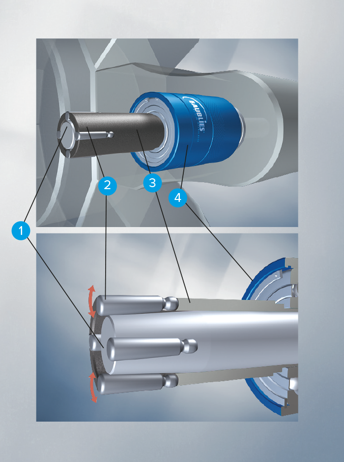 Der Konus (1) ist fest mit der Werkzeugaufnahme (4) verbunden und der Käfig (3) mit den rotierend gelagerten Rollen (2) frei drehbar.