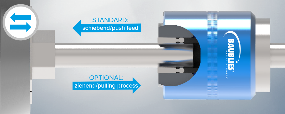 Standardmäßig erfolgt das Glätten der Oberfläche im Vorschub schiebend. Optional sind alle Außenrollierwerkzeuge auch für die ziehende Bearbeitung lieferbar.
