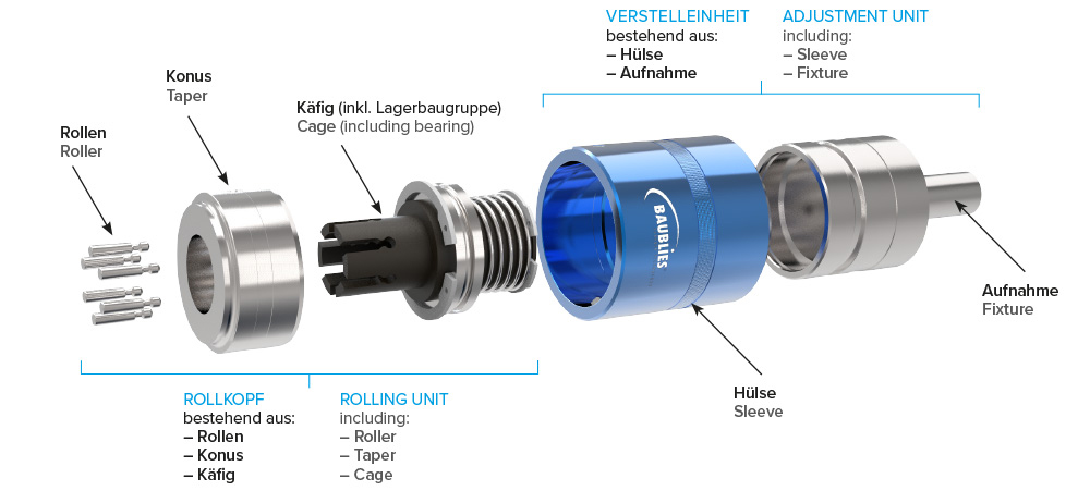 Ein Konus stützt die in einem Käfig geführten Rollen ab und sorgt für die Anpresskraft zum Umformen des Materials. Der Walzdurchmesser wird durch Axialverschiebung des Konus zur Rolle verstellt.