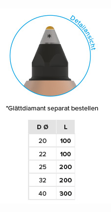 - Glättdiamantradien von 0,4 bis 5 mm verfügbar